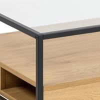 Прямоугольный журнальный столик Randolf, столешница из прозрачного закаленного стекла, 6 полок, матовый дикий дуб, шероховатый меламин, квадратное основание, матовый черный шероховатый металл с порошковым покрытием, с открытым отделением, 120x60x40 см